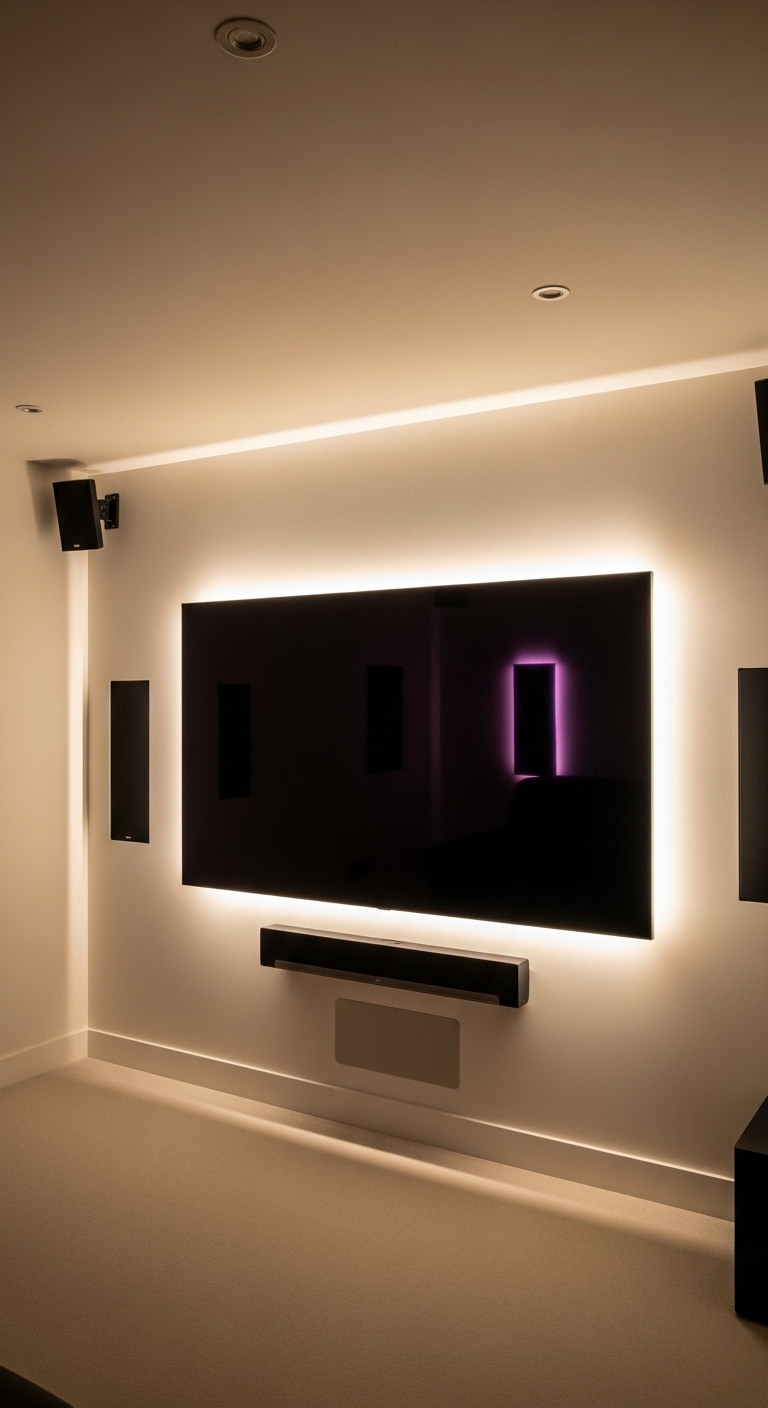 Soundbar mounting, speaker placement, and full surround-sound wiring for an immersive experience.